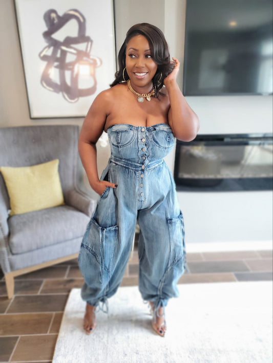 Denim Strapless Cargo Jumpsuit | Review Description & Return Policy