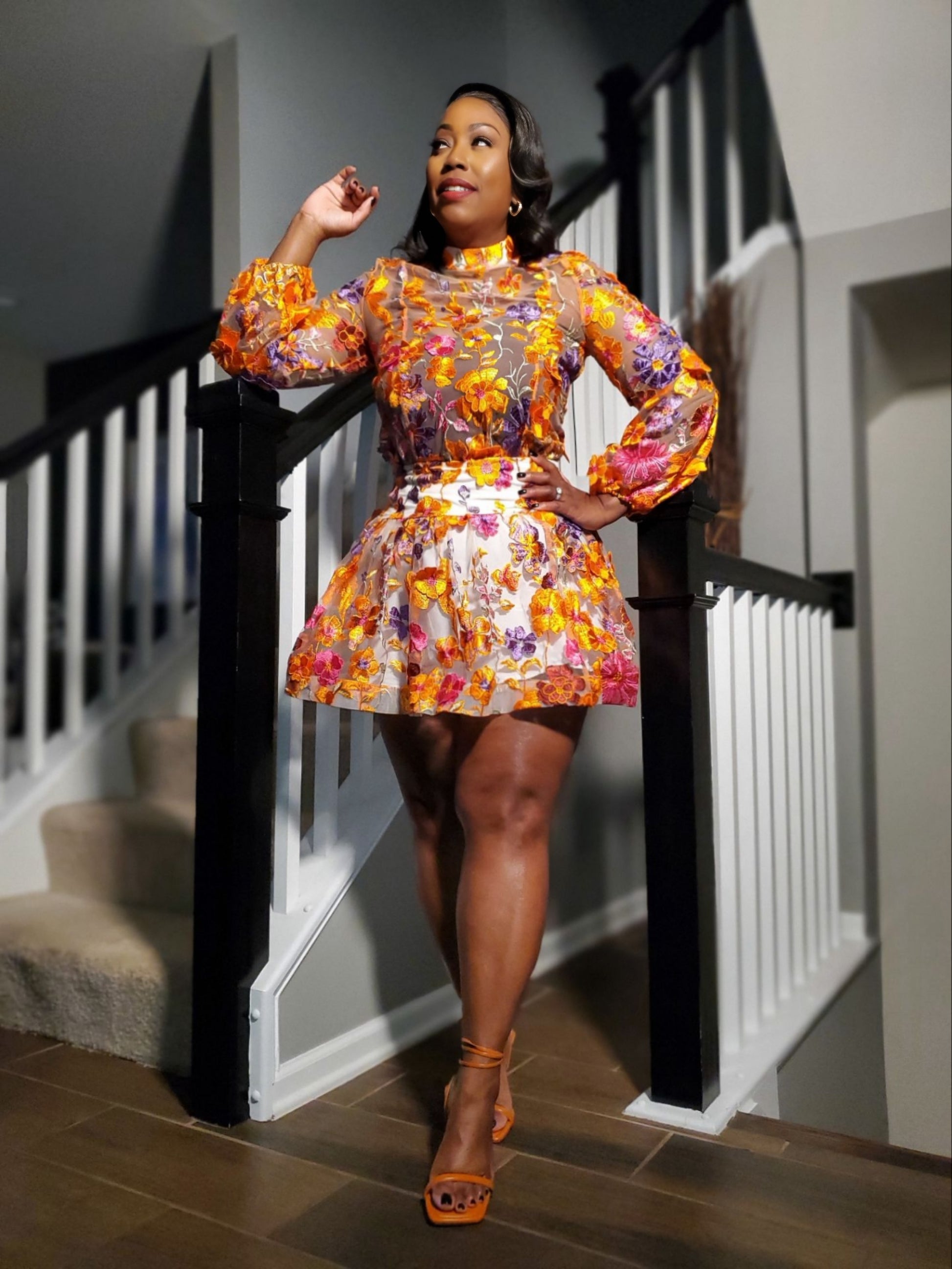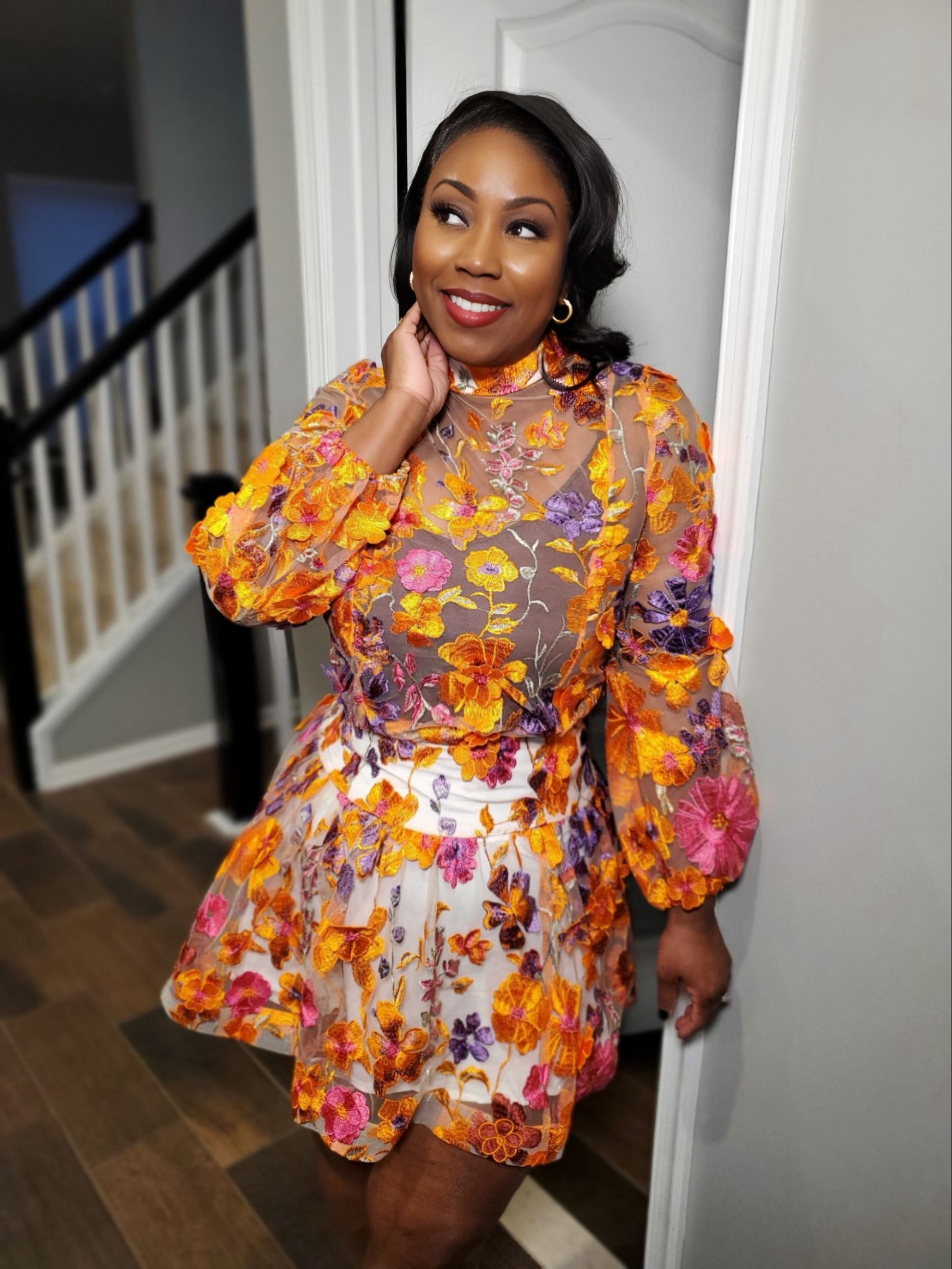 Make a bold statement with our Blooming Elegance Two-Piece Set, a stunning ensemble that exudes confidence and femininity. Featuring a sheer, long-sleeve embroidered floral top with a high neckline and delicate ruffle details, this set pairs beautifully with a flowy, high-waisted matching skirt. The vibrant mix of orange, pink, and purple florals on a white base creates an eye-catching contrast, perfect for brunch, special occasions, or a stylish night out. Elevate your wardrobe with this chic, head-turning outfit!