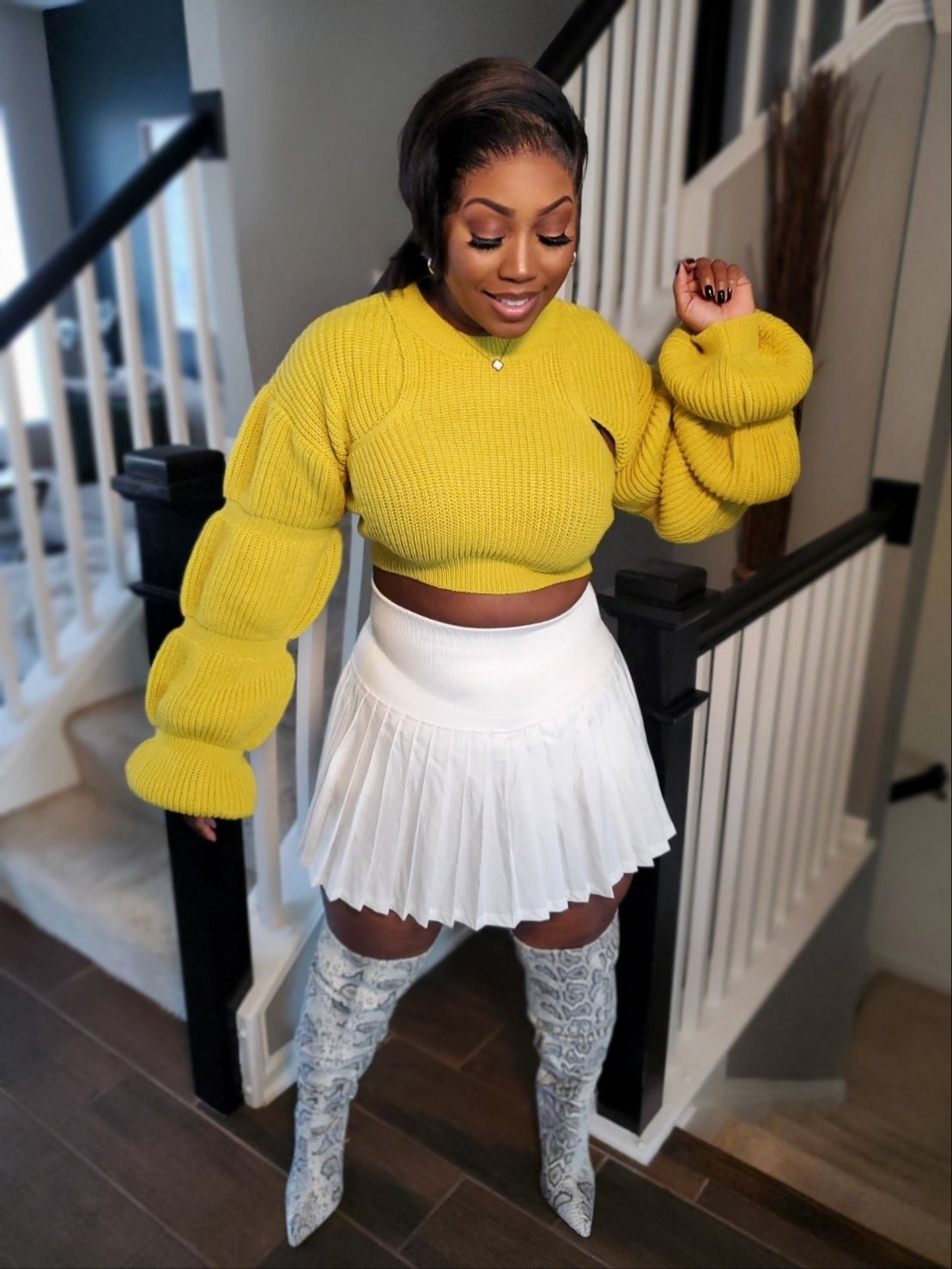 Add a pop of color to your fall wardrobe with the Chic Balloon Sleeve Crop Sweater. This vibrant mustard yellow sweater features dramatic bubble sleeves and a chic cropped fit that pairs perfectly with high-waisted skirts, jeans, or trousers.