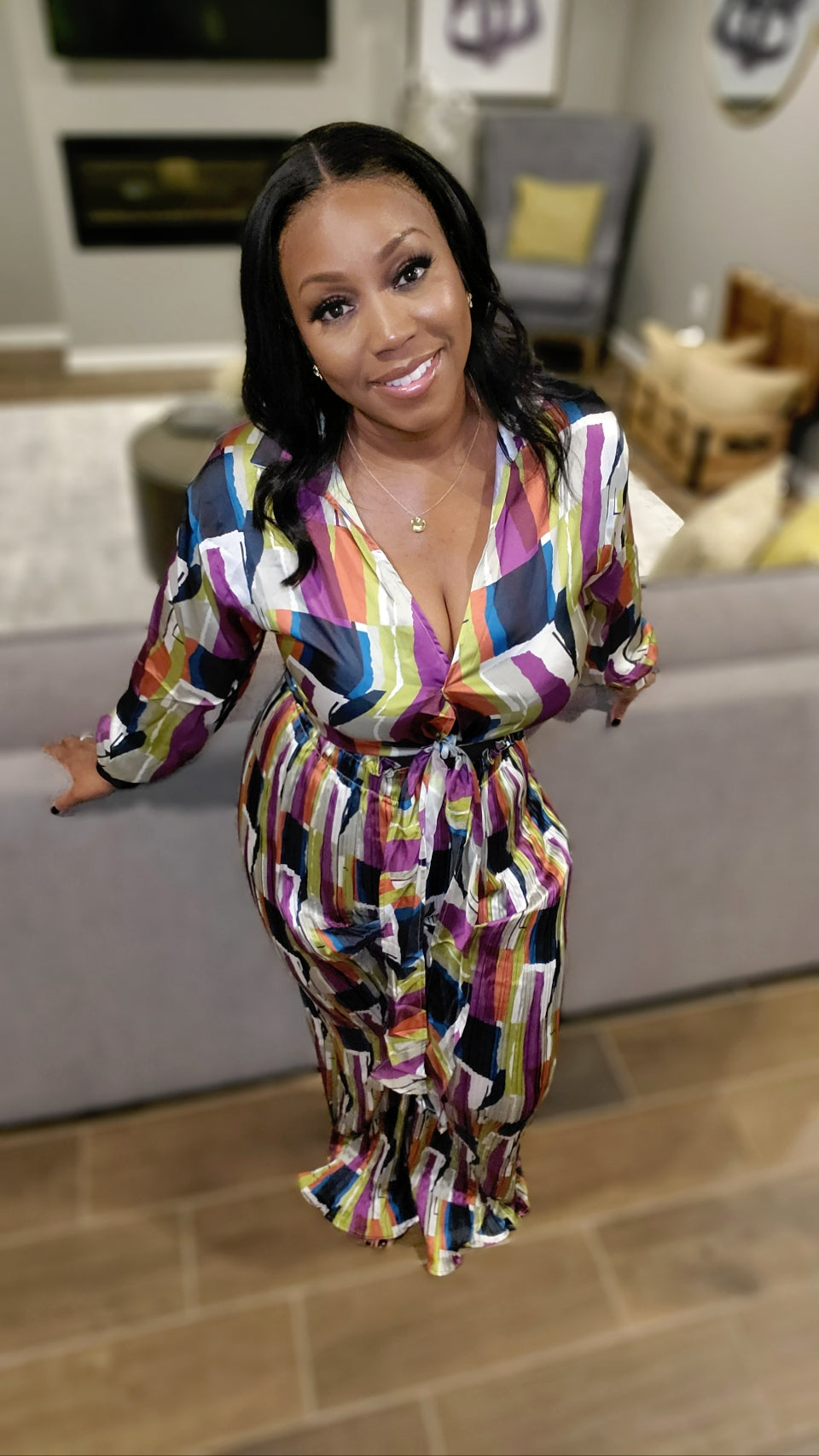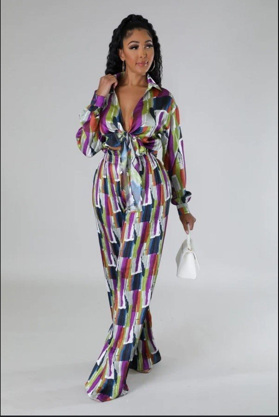 A stunning manifestation of vibrant artistry and sophisticated design. This two-piece set is a visual symphony of brush strokes, seamlessly blending shades of regal purple, lively chartreuse, and warm burnt orange. The high elastic waistline of the pleated pants ensures a flattering silhouette, providing comfort and style in every step.