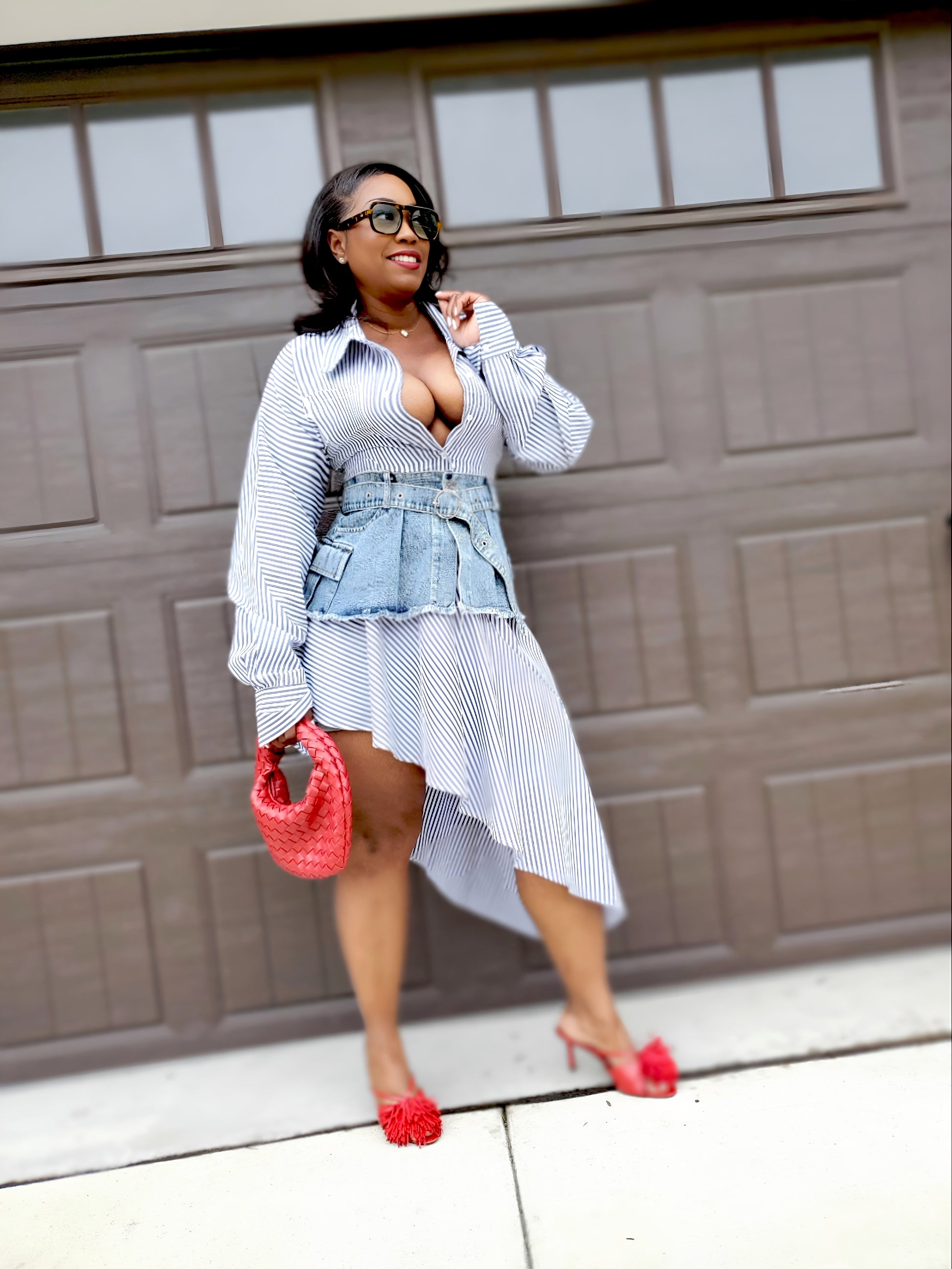 Command the room in our City Curves Striped Shirt Dress, designed for bold babes who mean business. This pinstripe button-down silhouette features a plunging neckline and an edgy denim corset-style belt that cinches the waist for that perfect hourglass shape. With its asymmetric hem and fierce feminine energy, this piece is ideal for brunch, day parties, or a confident street-style slay.