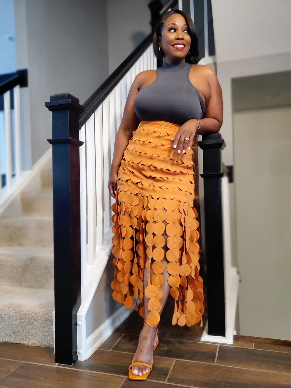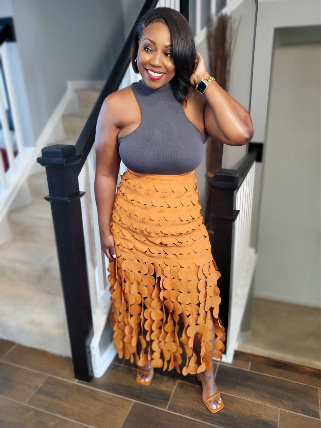 This stunning skirt features an intricate design of cascading circular patterns in a rich, golden-orange hue. The high-waisted fit flatters your silhouette, while the unique, flowing design adds a touch of whimsy and sophistication. Perfect for both casual and formal occasions, this skirt pairs beautifully with a fitted top and heels.