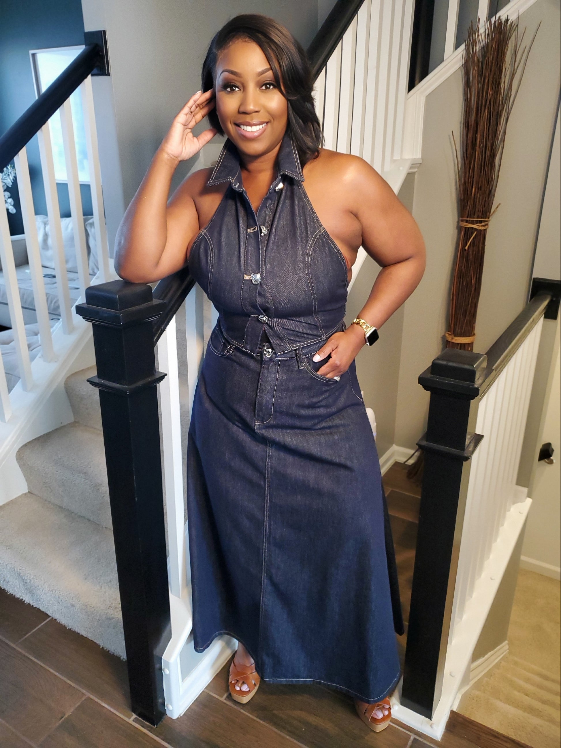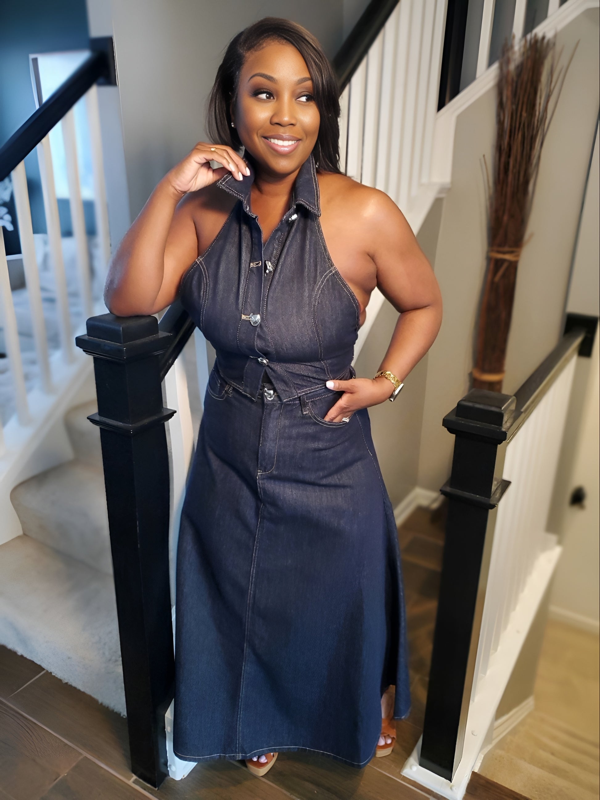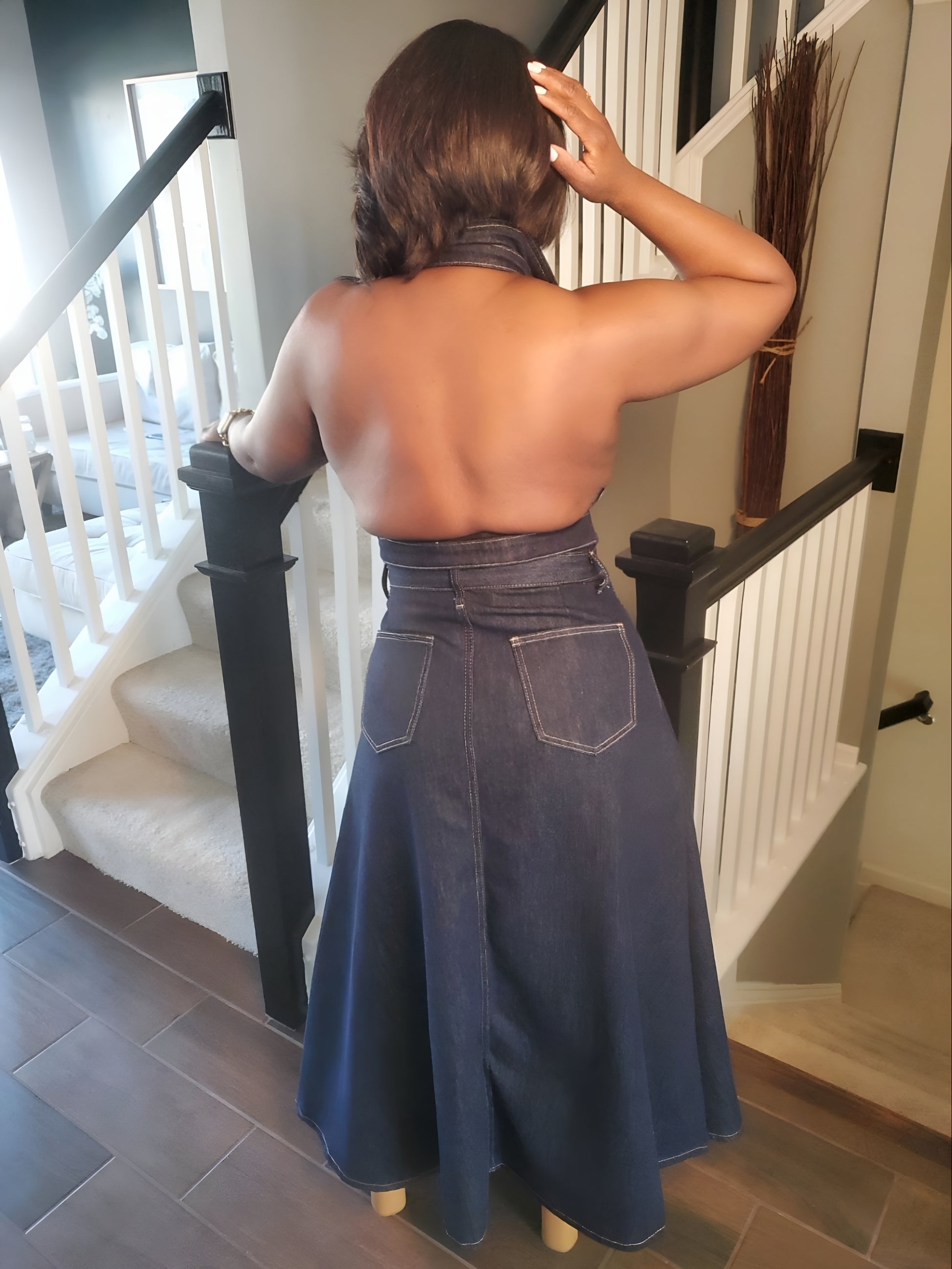This is a two-piece ensemble featuring a denim halter top with a sleek, open back and a matching full-length skirt. The top is secured with silver snap buttons that add a touch of glamour to the overall design, and its halter neck ties at the back, accentuating the shoulders and upper back. The skirt is high-waisted with a belt loop detail and also fastens with snap buttons, flowing down into an elegant A-line silhouette. This set combines comfort with a modern twist, perfect for various occasions from casual outings to more dressed-up events.