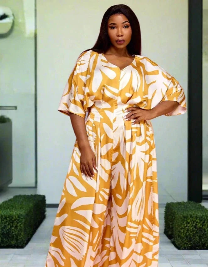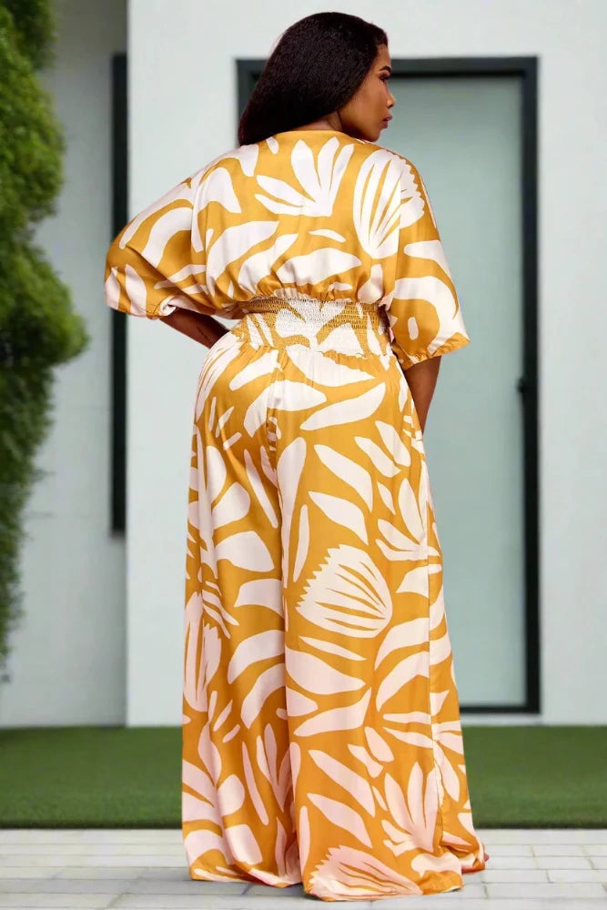 Step into effortless elegance with the Golden Palm Breeze Jumpsuit. This luxurious piece features a stunning mustard and ivory tropical print that exudes both vibrancy and sophistication. The wide-leg design and flowy silhouette provide comfort and drama, perfect for making a bold statement at any occasion. With its relaxed fit, airy sleeves, and cinched waist, this jumpsuit flatters your figure while keeping you cool and confident. Whether you’re heading to a summer brunch or an evening out.