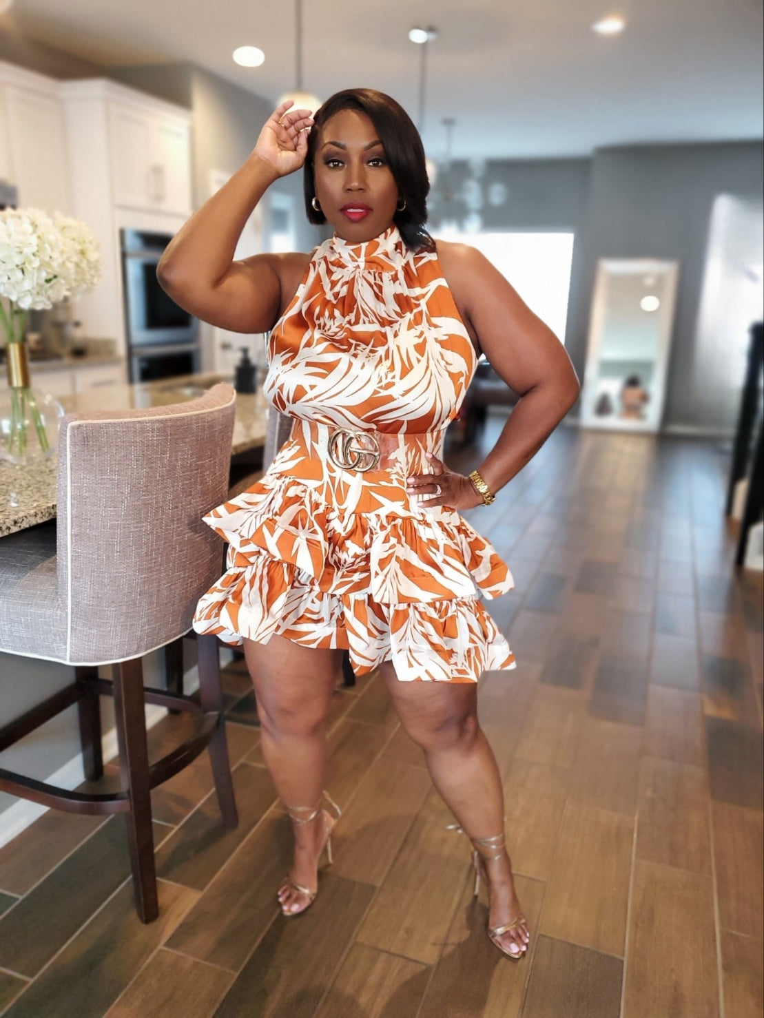 This eye-catching dress features layers of ruffles with a striking orange and white palm leaf print, perfect for making a bold statement. The halter tie-back design adds a touch of allure, allowing for a customized fit, while the waist tie belt (NOT PICTURED) cinches in to accentuate your figure.