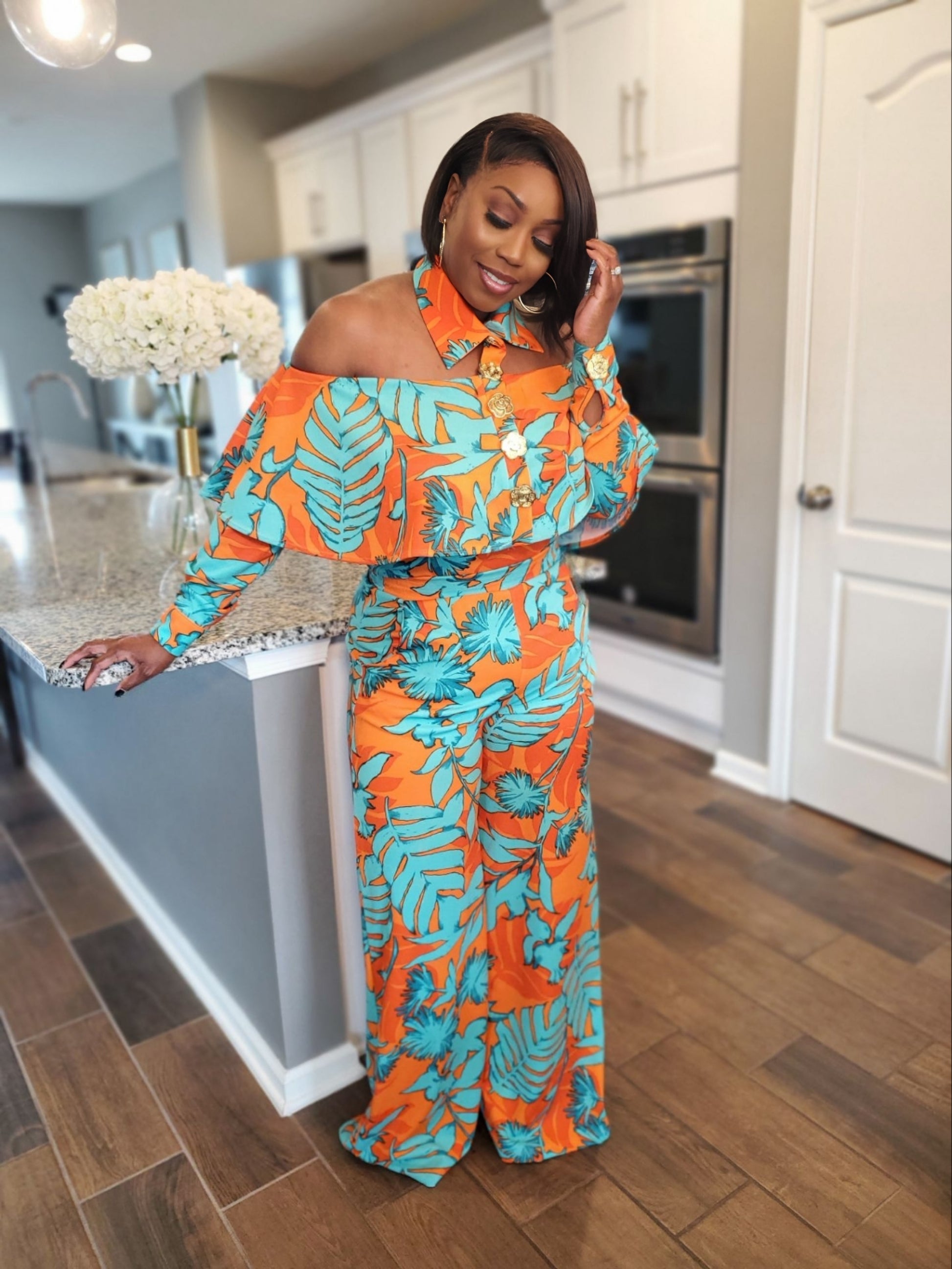Turn heads in this two-piece pant set, a bold tropical statement that blends sunshine vibes with fierce femininity. Featuring a vibrant orange and turquoise leaf print, includes a wide-leg pant and a unique off-shoulder, halter-style top with gold button detailing.