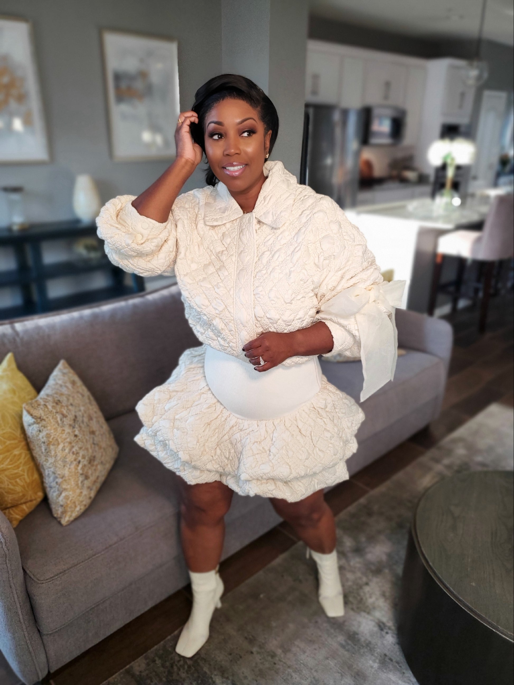 Elevate your style and comfort with this luxe two-piece set. This chic ensemble features a textured quilted jacket with oversized sleeves and a flattering arm tie, paired with a matching mini skirt for a complete look. The luxurious fabric and unique design offer both warmth and sophistication, perfect for cooler seasons or stylish wear.