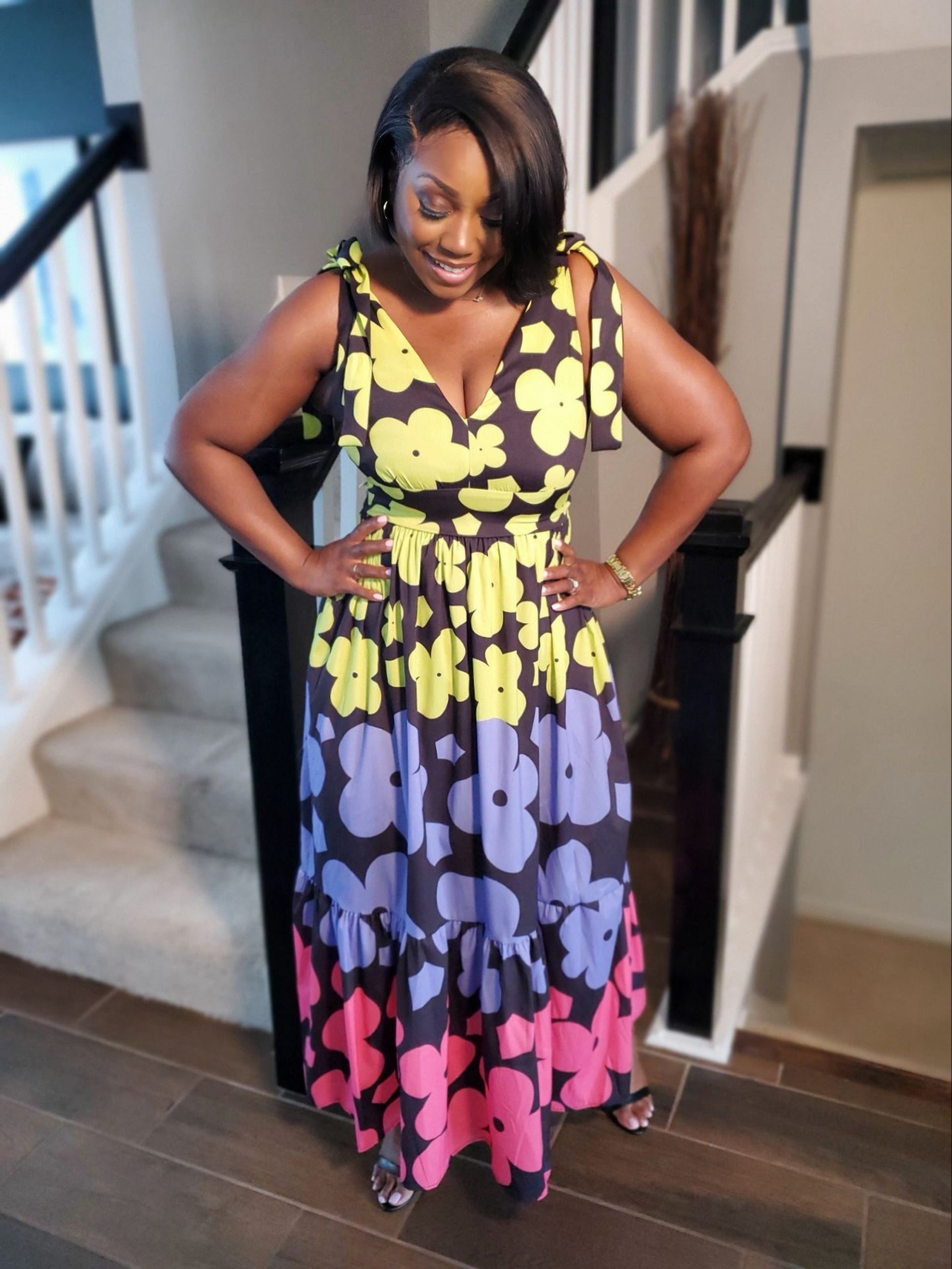 Introducing the Midnight Blooms Maxi Dress, a stunning and vibrant addition to your collection. This eye-catching dress features a striking pattern of large, colorful floral prints against a deep, midnight background, creating a bold and beautiful contrast. The sleeveless design and V-neckline offer a flattering silhouette, while the adjustable shoulder ties add a playful and customizable touch.