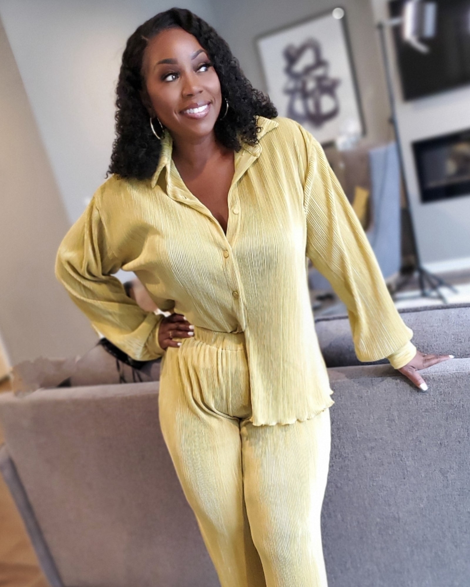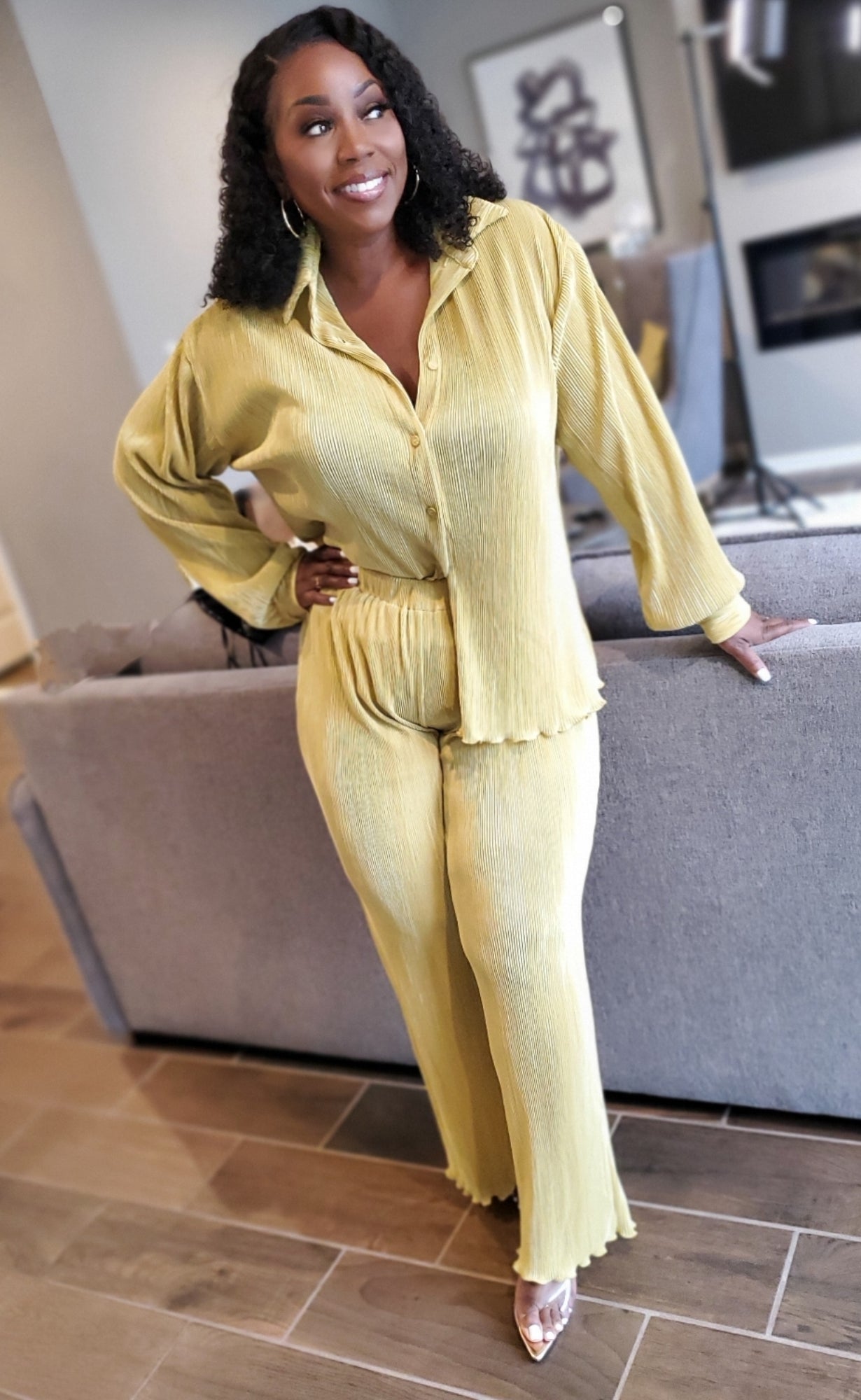 The Pleated Collar Set is a stylish and comfortable outfit perfect for any spring/summer occasion. The set features a button-down collared top with pleated detailing and a matching pair of pants with an elastic waistband for a comfortable fit. The collared top adds a touch of sophistication while the pleated detailing adds a trendy and stylish element to the outfit.