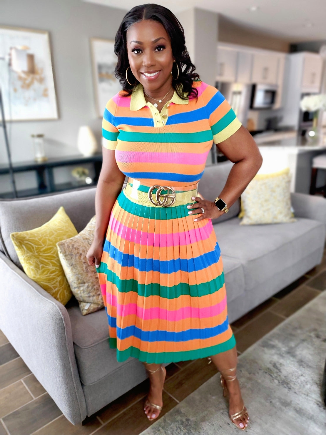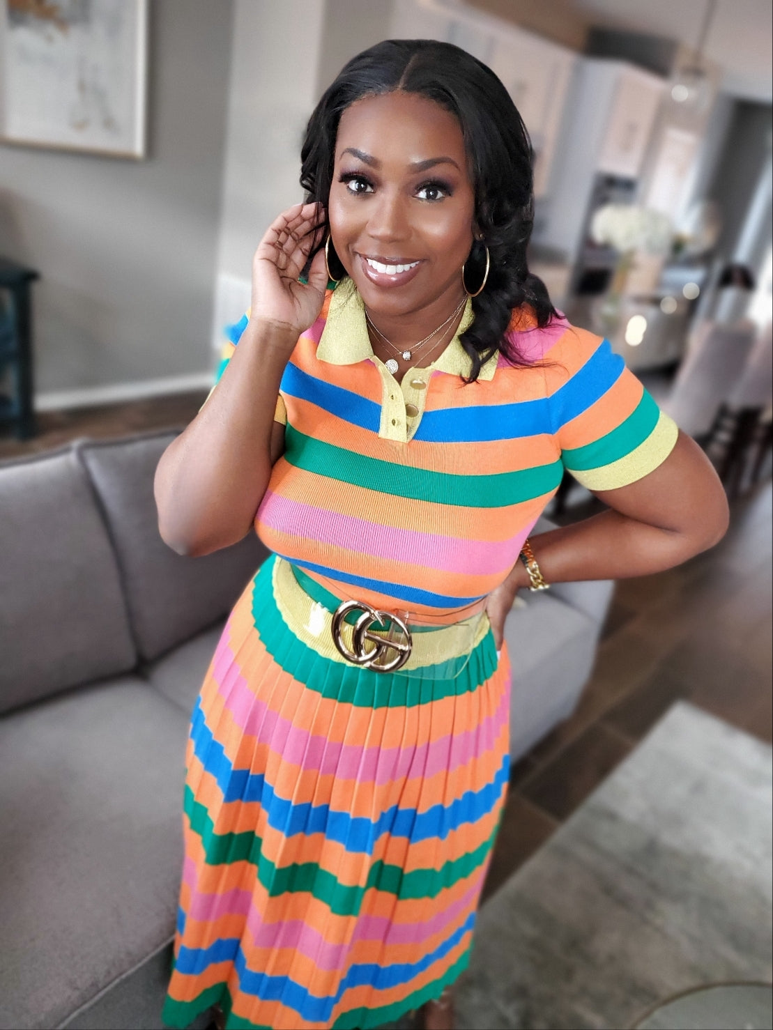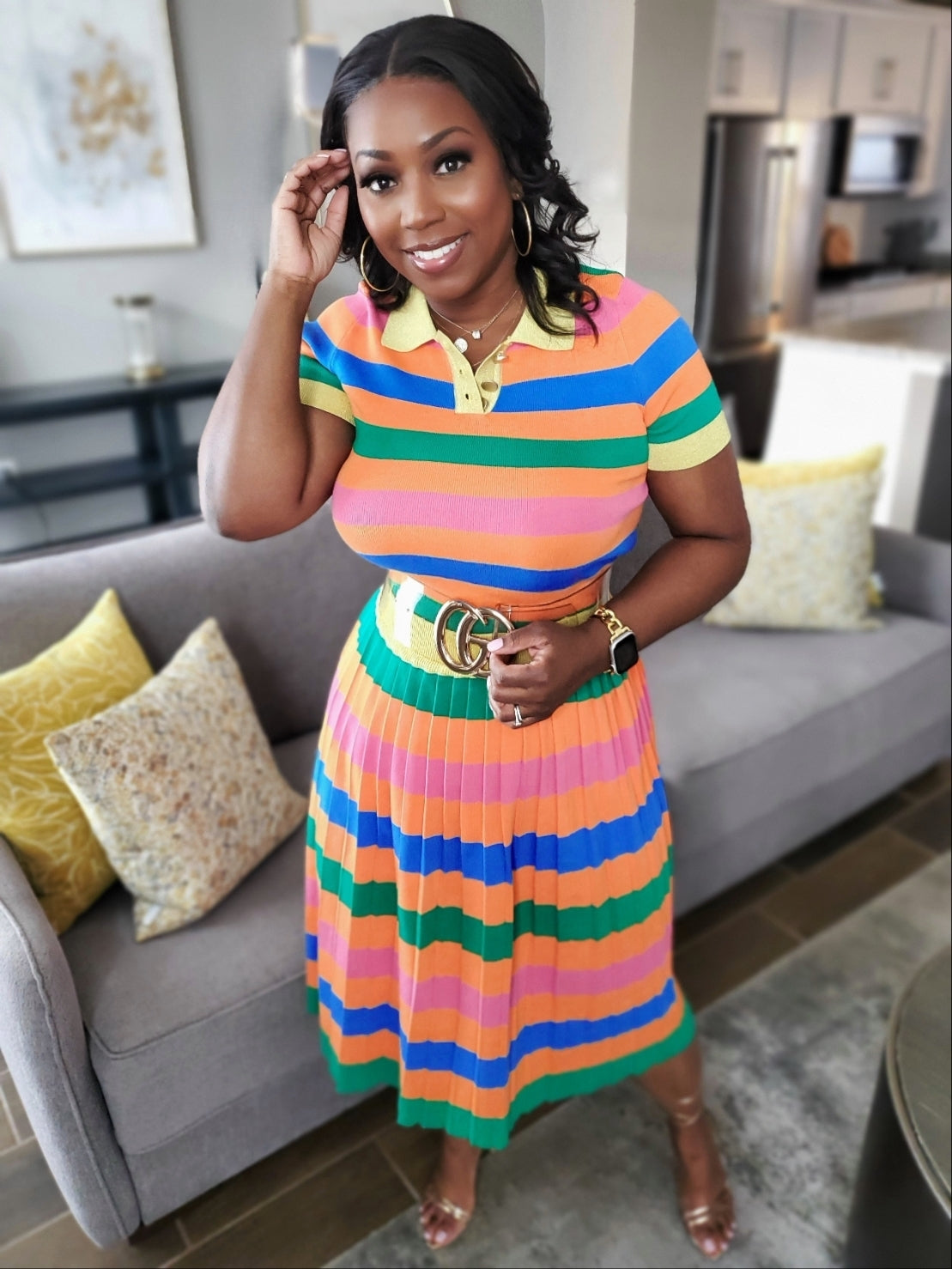 Elevate your casual wardrobe with our pleated striped two-piece skirt set. Crafted from soft, stretchy knitted fabric, this set combines comfort with style effortlessly. The T-shirt top features a classic round neckline and short sleeves, providing a relaxed fit for all-day wear. Paired with a pleated skirt boasting chic stripes and an elastic waistband, this ensemble offers a flattering silhouette with a touch of trendy flair. Whether you're running errands or meeting friends for brunch, this versatile two-piece set ensures you'll look effortlessly fashionable wherever you go.