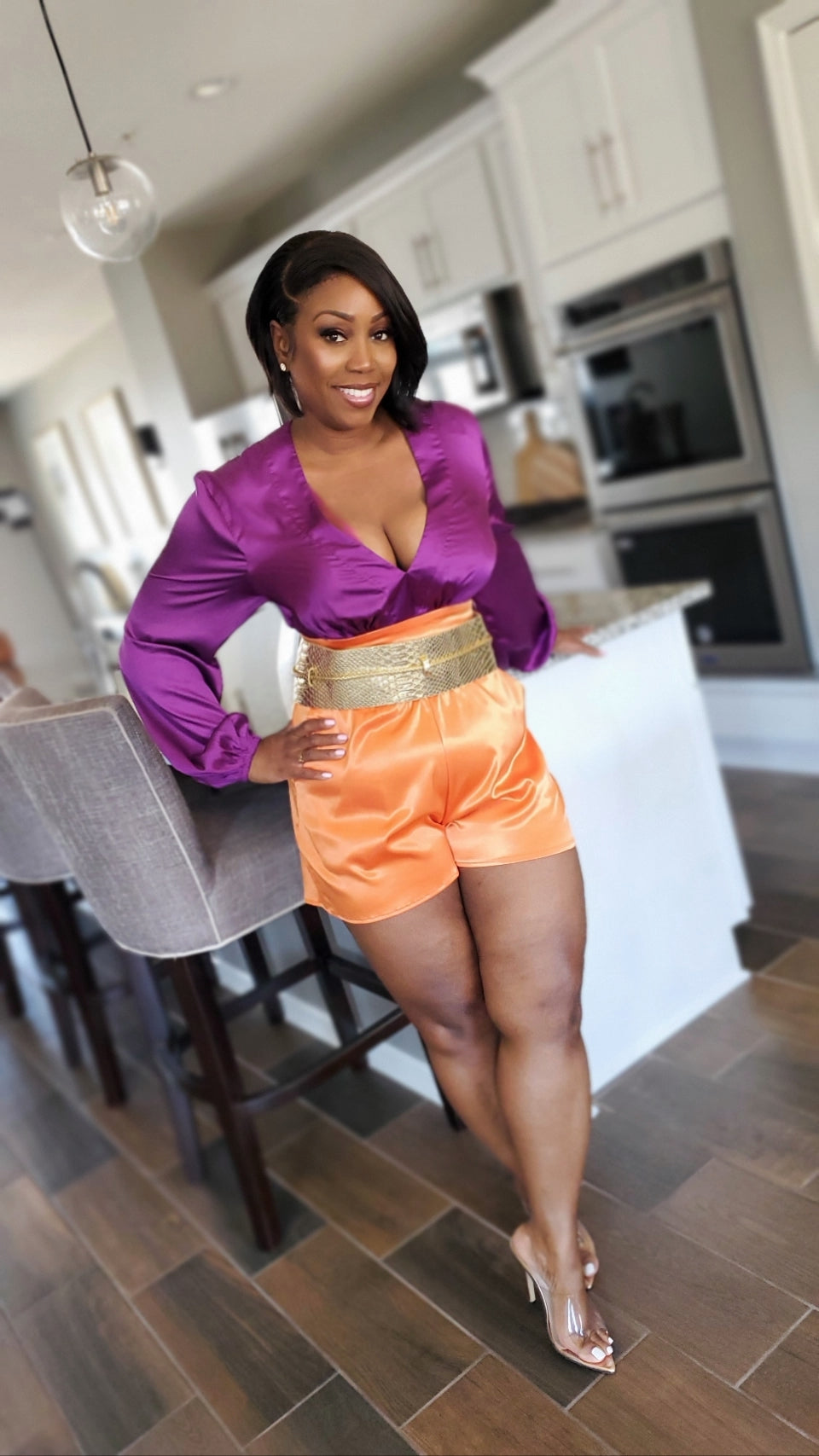 This vibrant two-tone purple and orange romper features a plunging V-neck, pinch pleated detail bodice, bubble sleeves, and A-line shorts accentuated with a removable gold belt.