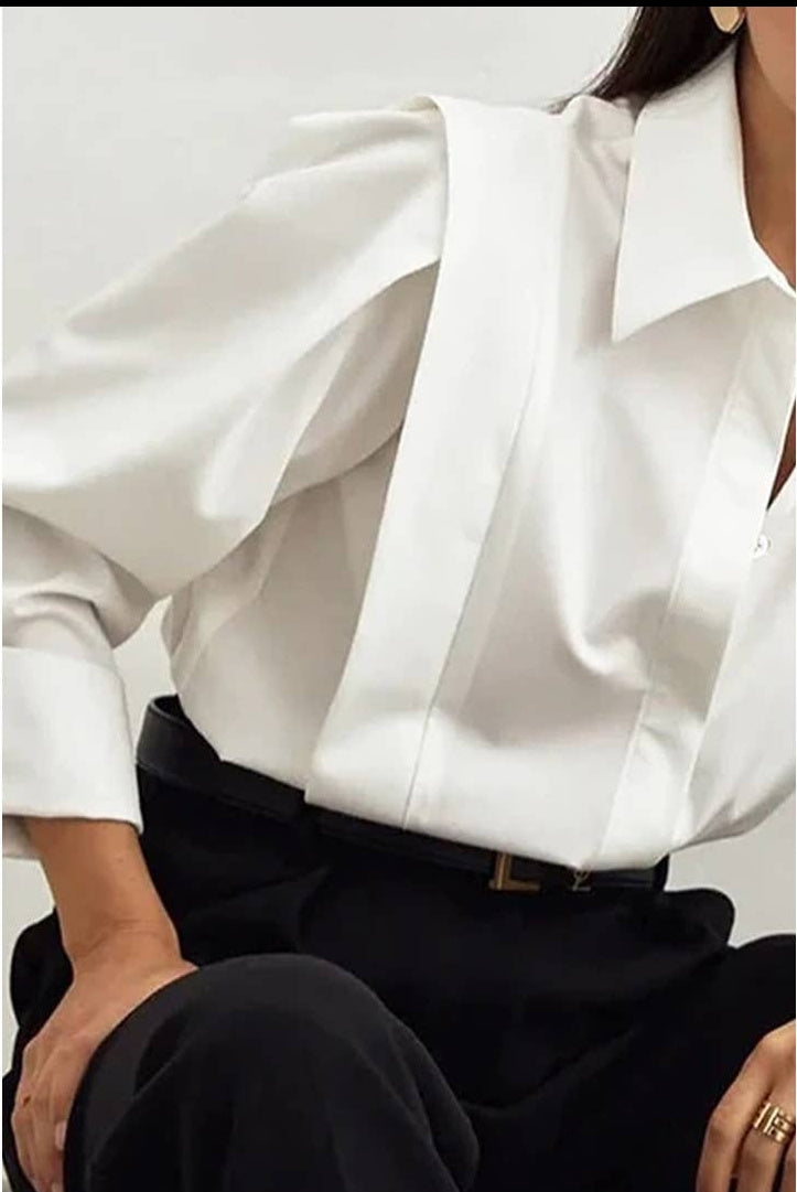 Featuring a crisply tailored form that skims the body with expert precision. This blouse showcases a sharp, structured collar that makes a statement while maintaining a sophisticated profile. Concealed button placket, creating a seamless look, and long sleeves ending in buttoned cuffs which offer a conventional touch to the otherwise modern piece. Its pure white fabric is versatile for various occasions, from office wear to upscale events.