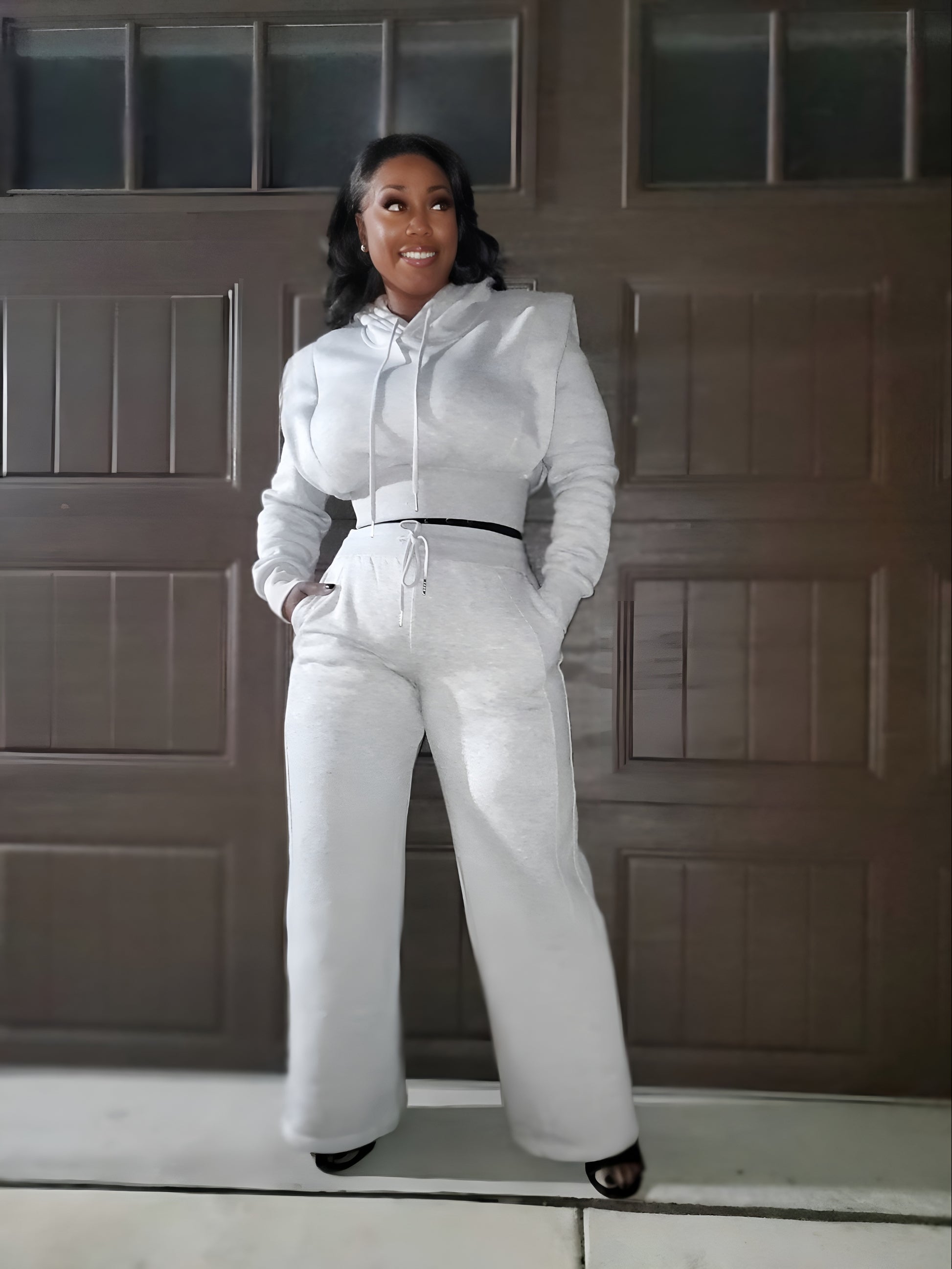 This two-piece outfit featuring a cozy cropped hoodie and matching high-waisted joggers. Made from soft, breathable fabric in a sleek heather gray color, this set combines comfort and fashion seamlessly. The drawstring waistband and relaxed fit ensure ease of movement, making it perfect for lounging, workouts, or casual outings. Pair it with your favorite sneakers for a modern, minimalist look.
