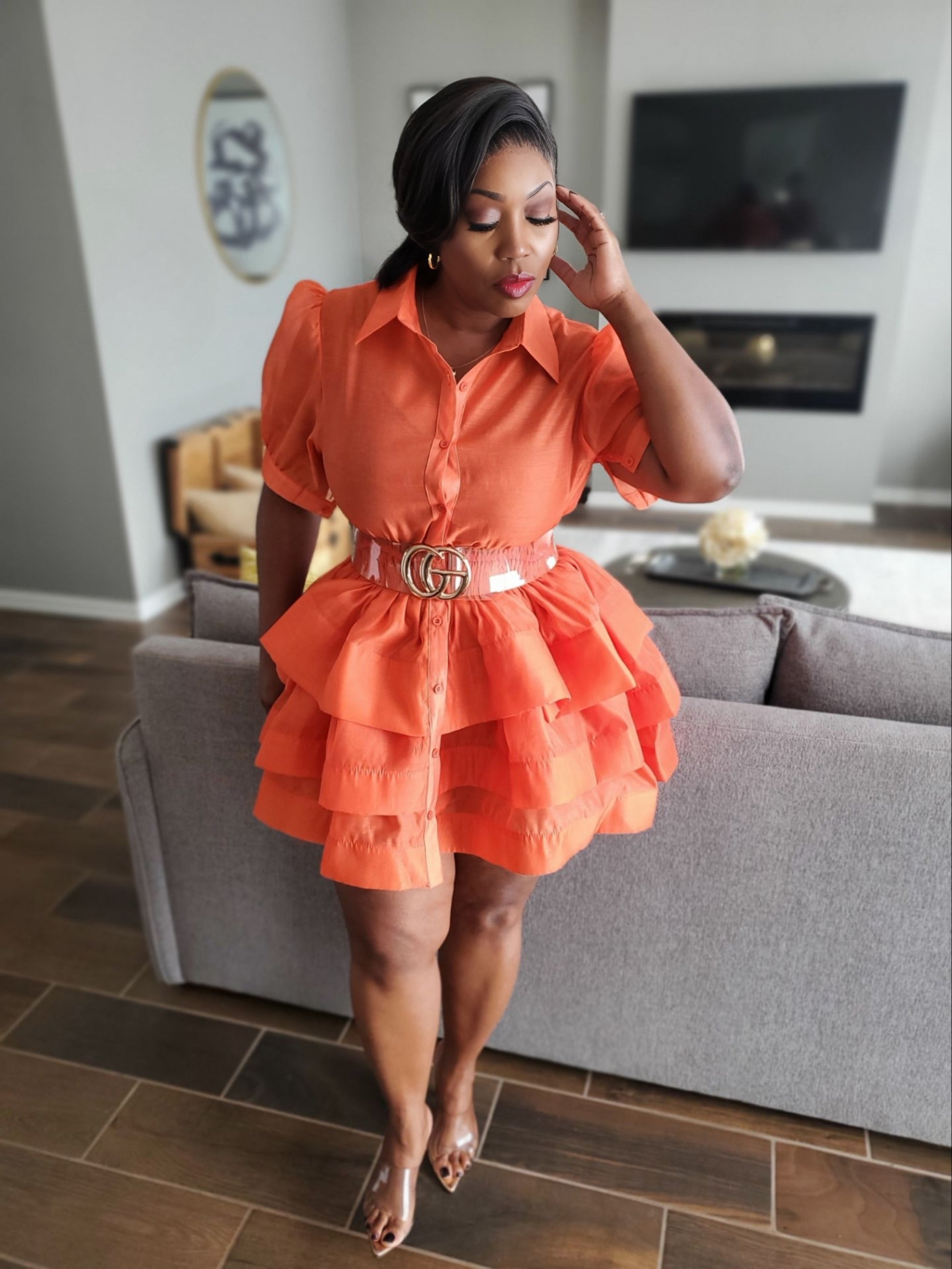Make a bold statement this fall with in this dress! Featuring eye-catching layers of ruffles and a structured button-down design, this mini dress brings a playful yet polished look to your wardrobe. The rich tangerine hue is perfect for autumn, adding warmth and vibrance to any occasion.