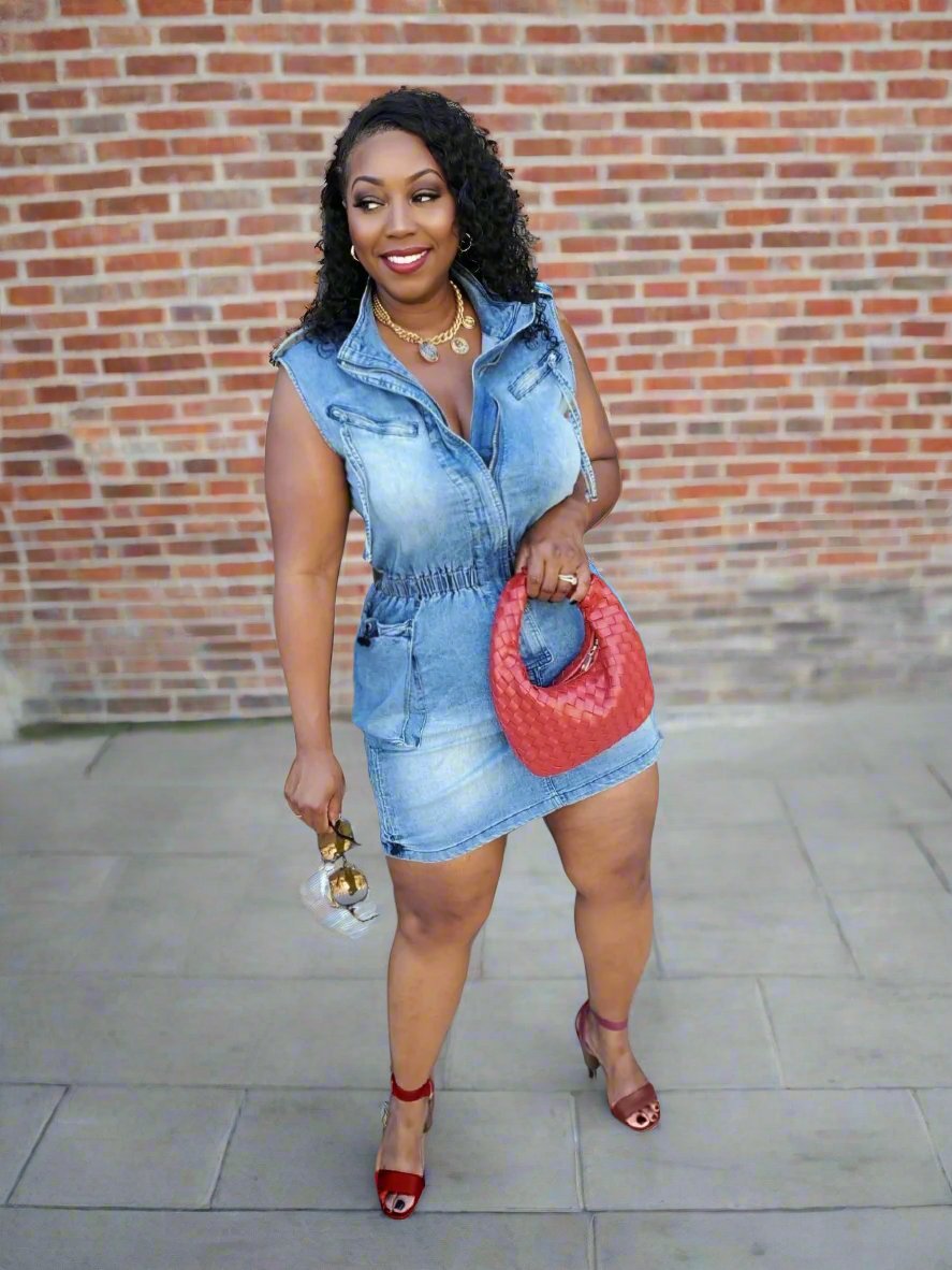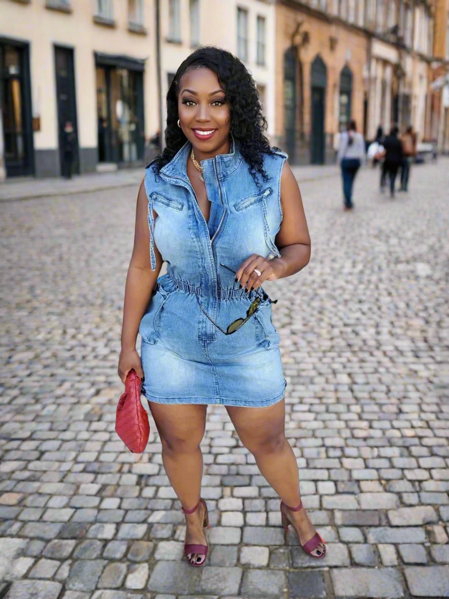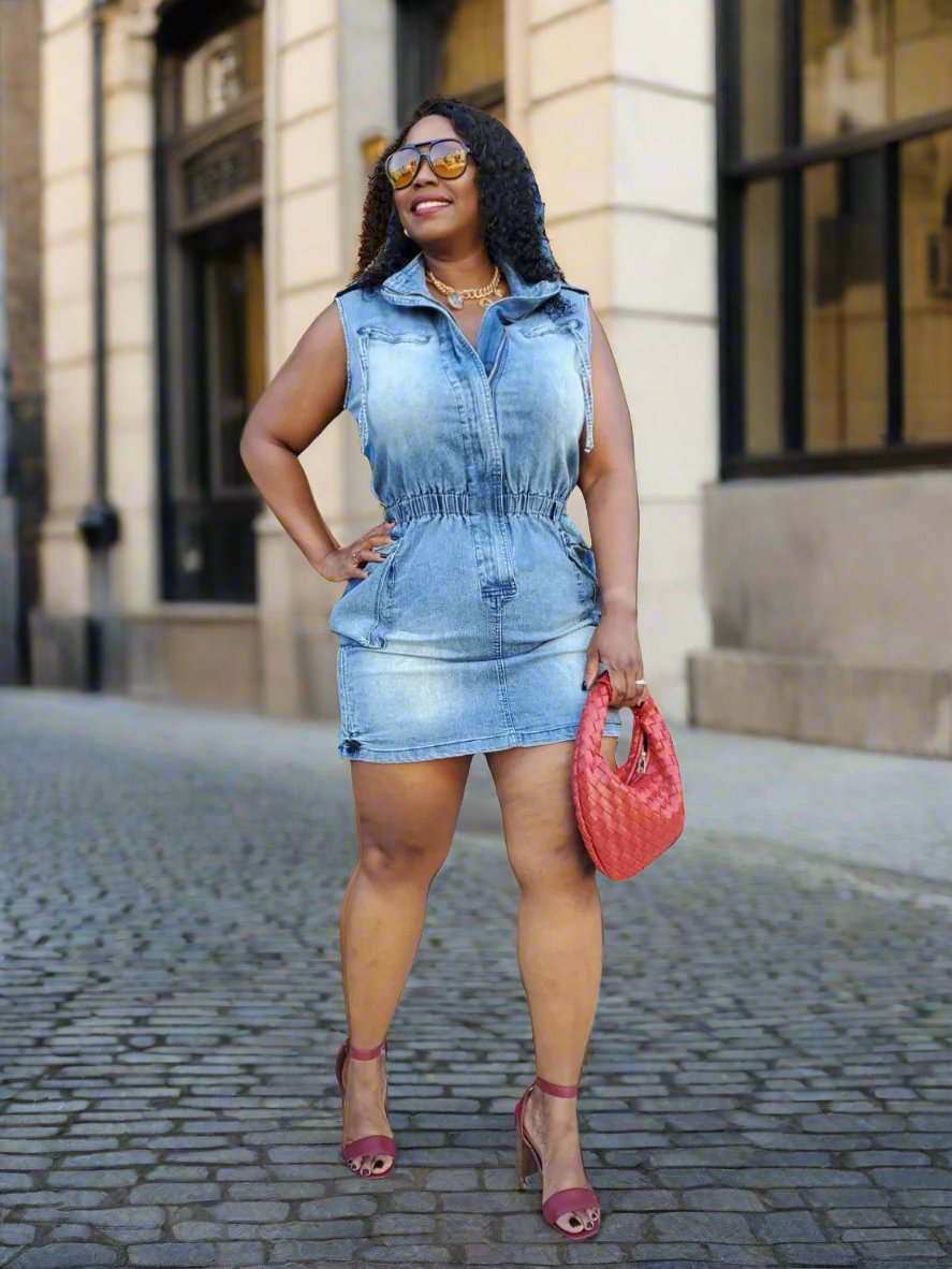 Step out in style with our Street Style Denim Cargo Dress, a perfect blend of comfort and fashion. This versatile dress features a sleeveless design with a flattering cinched waist, creating a silhouette that complements all body types. The distressed denim adds a trendy, lived-in look while the practical cargo pockets provide a touch of utility.