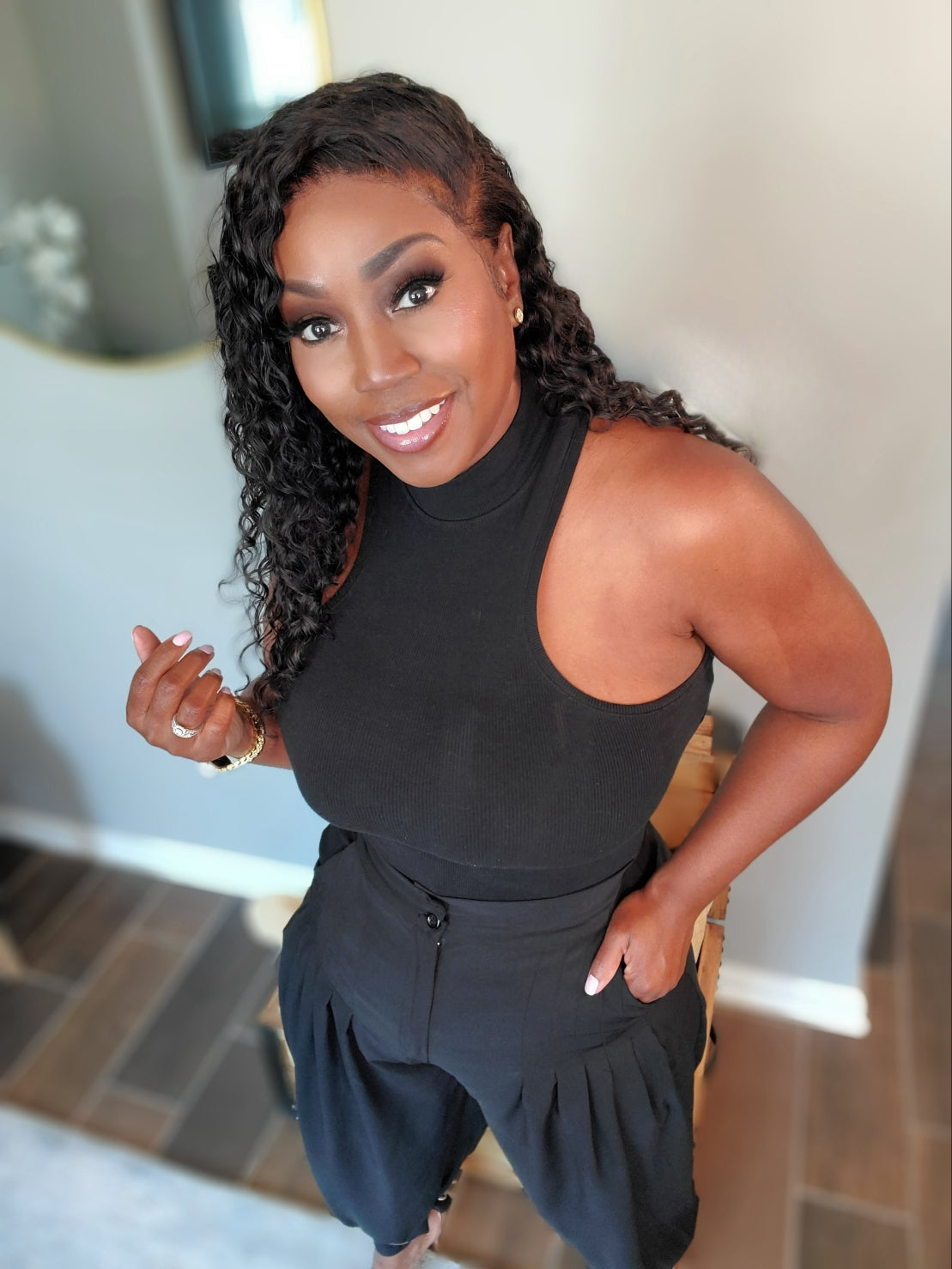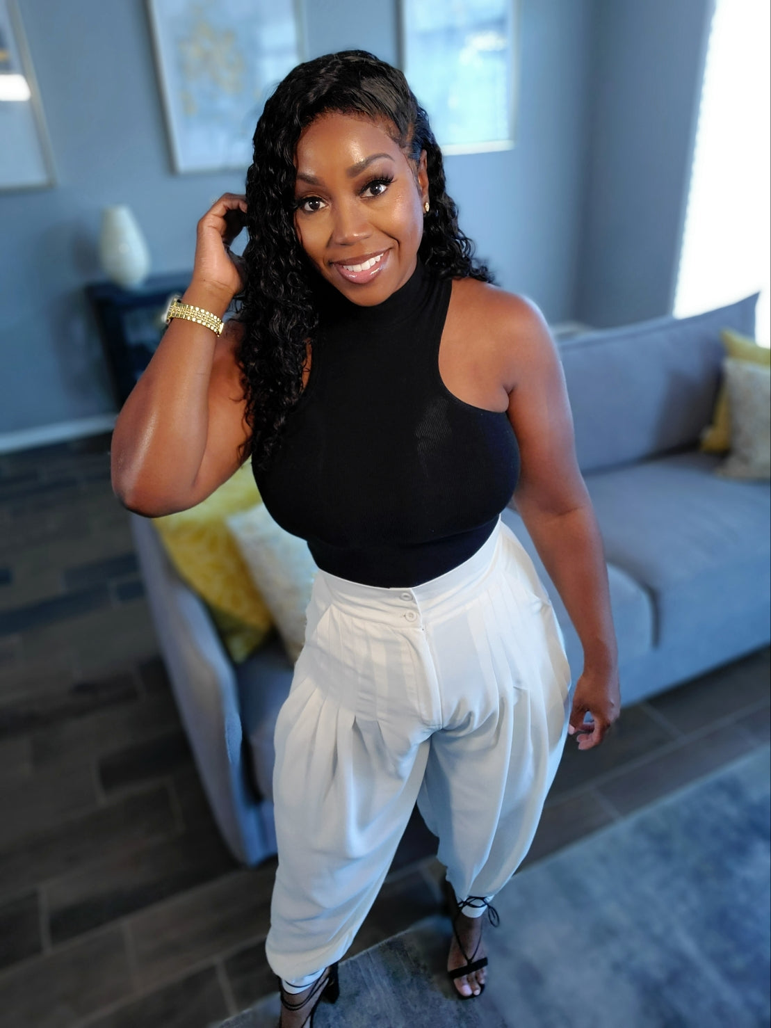 At the waist, a high rise creates a flattering silhouette that accentuates your natural curves while elongating your legs. The pleats cascade gracefully from the waist, adding depth and texture to the fabric, while also offering a touch of vintage charm that never goes out of style.