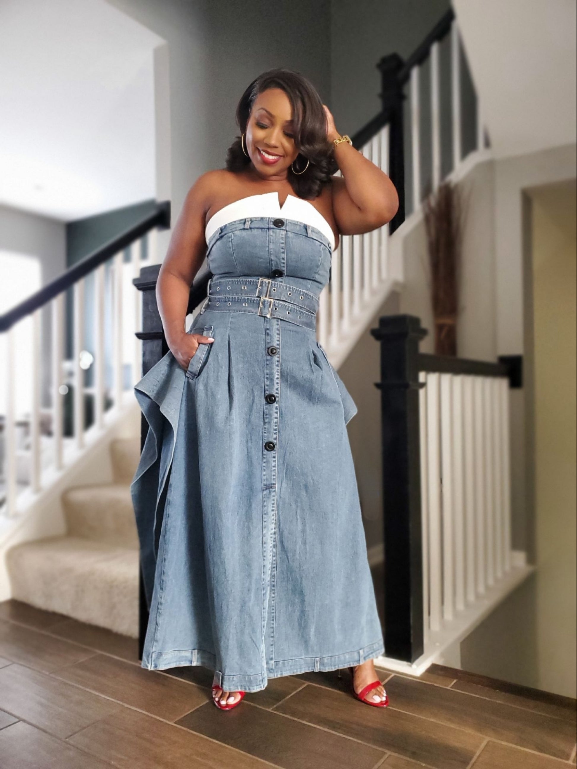 Uptown Edge Strapless Trench Dress in Denim | Review Description & Return Policy