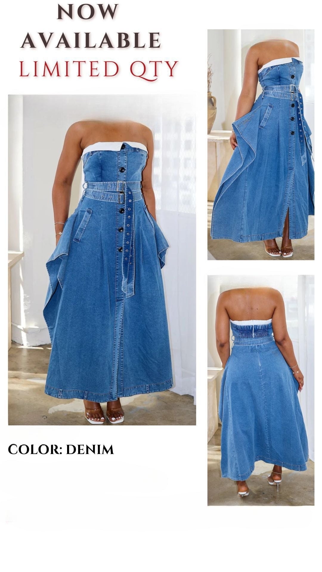 Make power moves in our Uptown Edge Strapless Trench Dress in Denim. Featuring a flattering belted waist, statement black buttons, and a tailored silhouette, this sleeveless stunner is the definition of confidence and class. Perfect for brunches, networking events, or a stylish city stroll. Pair it with bold heels for a complete head-turning look.