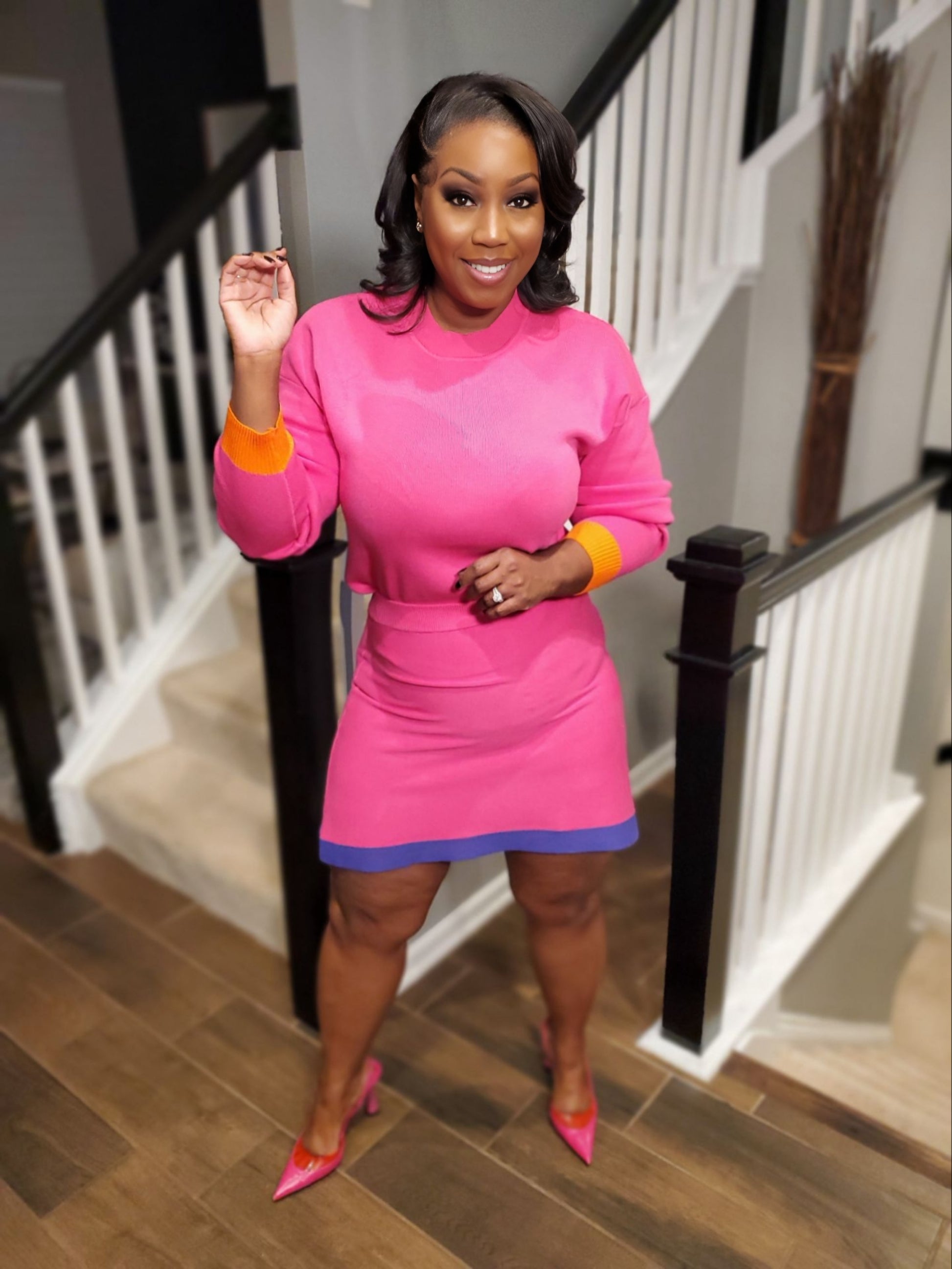 Elevate your wardrobe with this bold and chic two-piece skirt set. Featuring a vibrant pink sweater top with orange cuffs, paired with a matching mini skirt accented with a purple hem. Perfect for making a statement at work, brunch, or a night out. Stylish, versatile, and crafted for modern fashion lovers. Perfect with adding the Pointed Triangle Lapel Detachable False Collar for the right contrast.