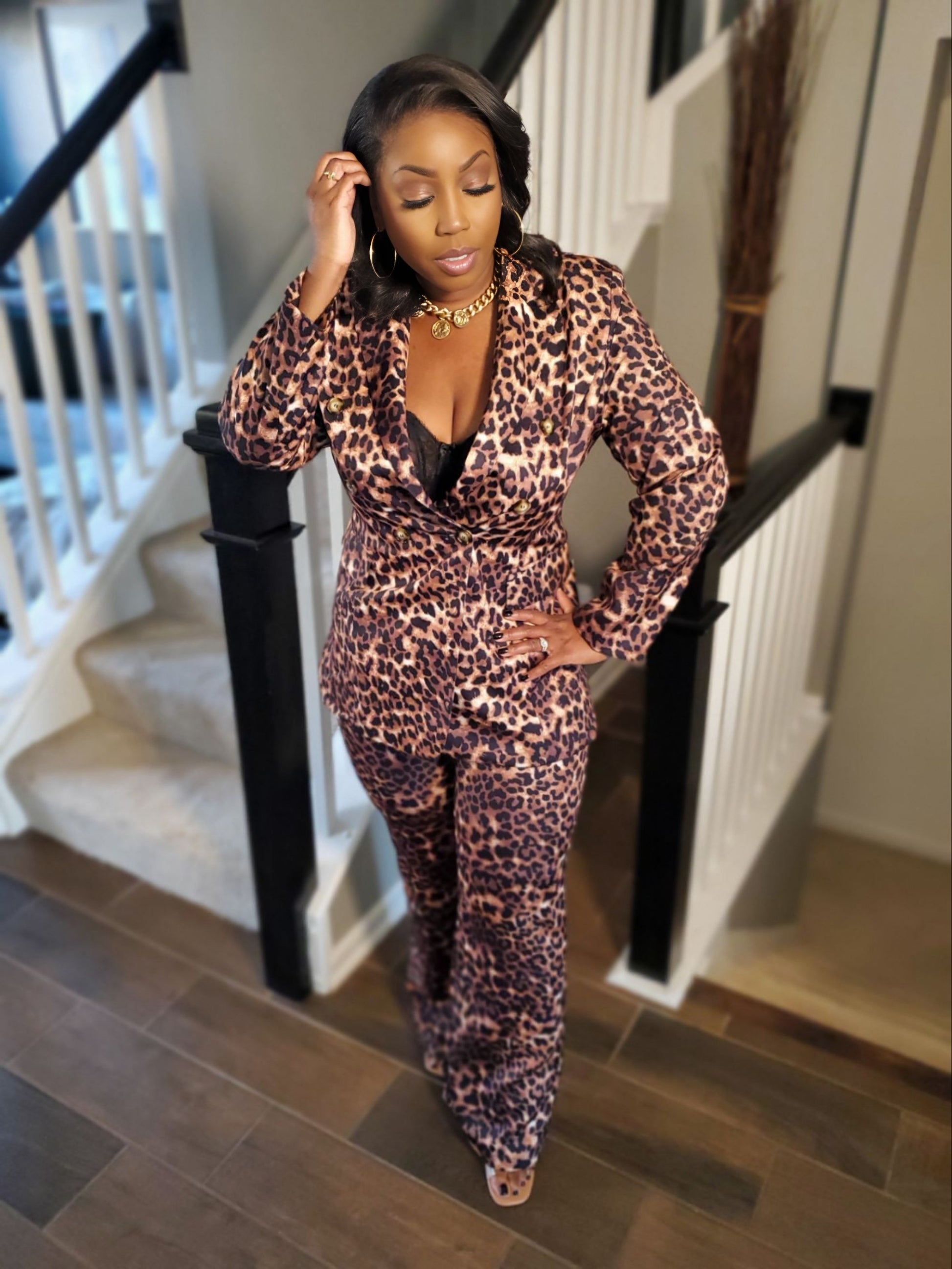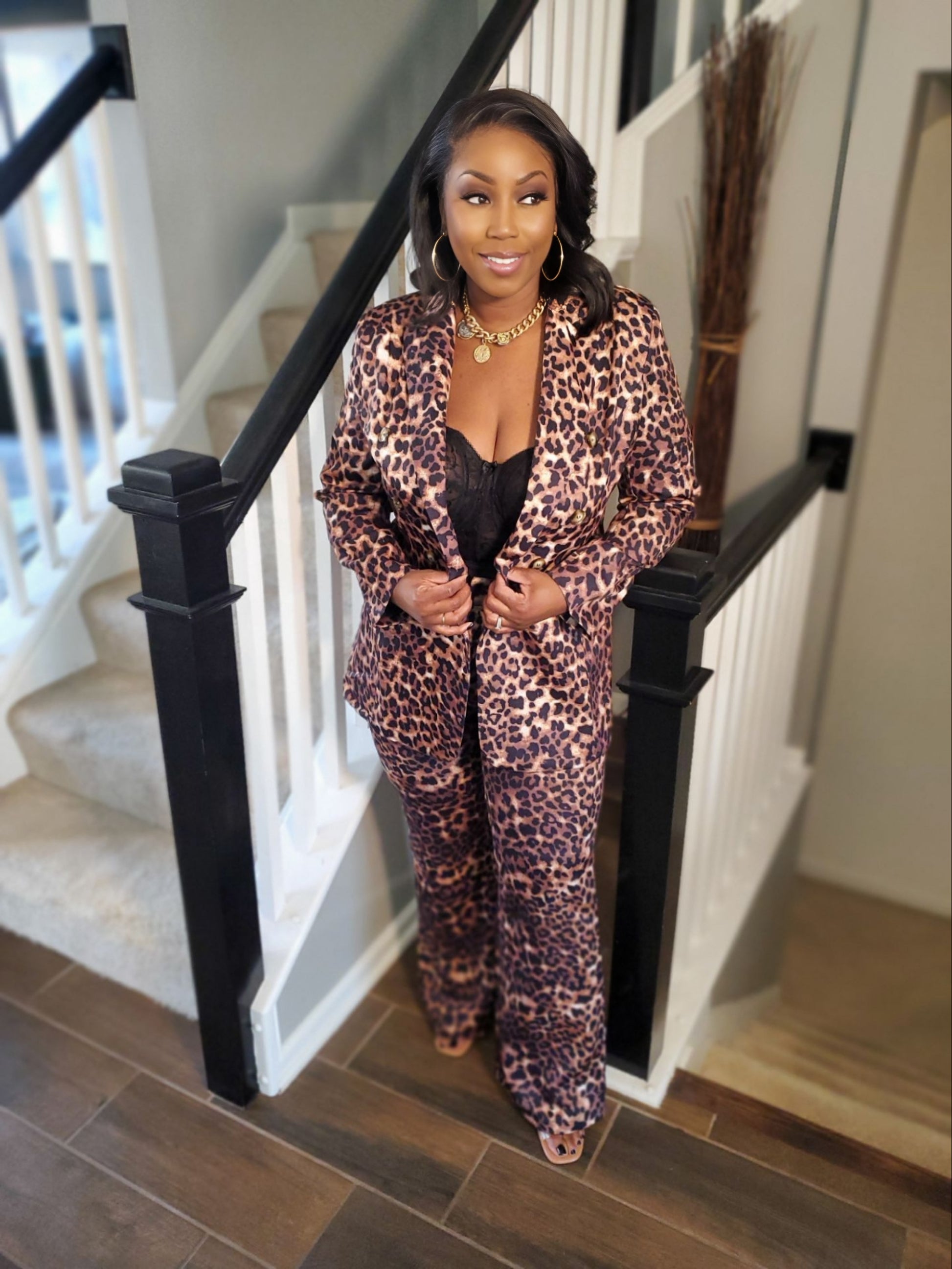 A fierce and fashionable statement set designed for boss moves and high-impact style. This two-piece suit features a tailored double-breasted blazer with gold button details and matching high-waisted wide-leg pants, creating a sleek and sophisticated silhouette. The luxurious animal print fabric adds a daring touch, making this outfit perfect for business chic, night outs, or special occasions.
